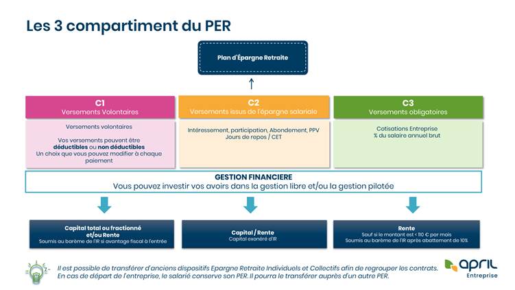 Le PER est structuré autour de trois compartiments, qui correspondent à l’origine des versements. Grâce à cette organisation, vous pouvez regrouper différents types d’épargne au sein d’un même dispositif, tout en conservant des règles de liquidation et fiscales propres à chaque source de financement.